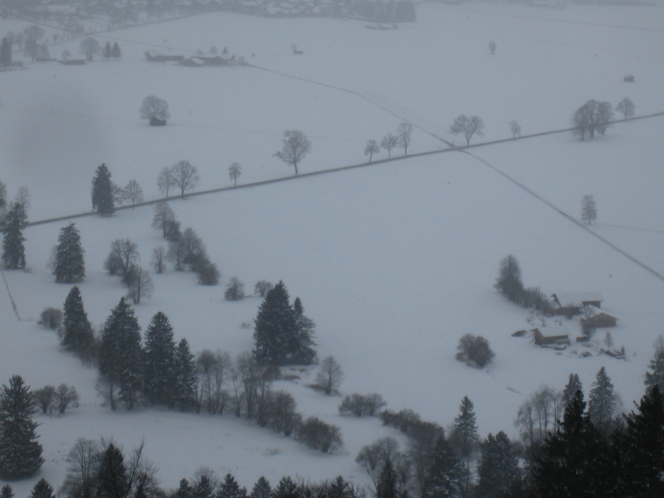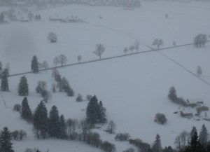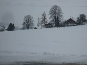 There are no more seats in the car with the tour guide that are facing forward . We go in the next car by ourselves. As we are traveling, the scenery flashing by is getting whiter and whiter. It is starting to look alot like the weather reports from the ski slopes in the Bavarian Alps that I watched on TV this morning. I check to make sure the tour guide is still on the train. All the pictures I have seen of Neuschwanstein, show it as sunny and very green. I thought we had missed the sunny and green stop. I didnt know that southwest Bavaria meant the Alps or that November meant winter. I have lived in California for too long.
