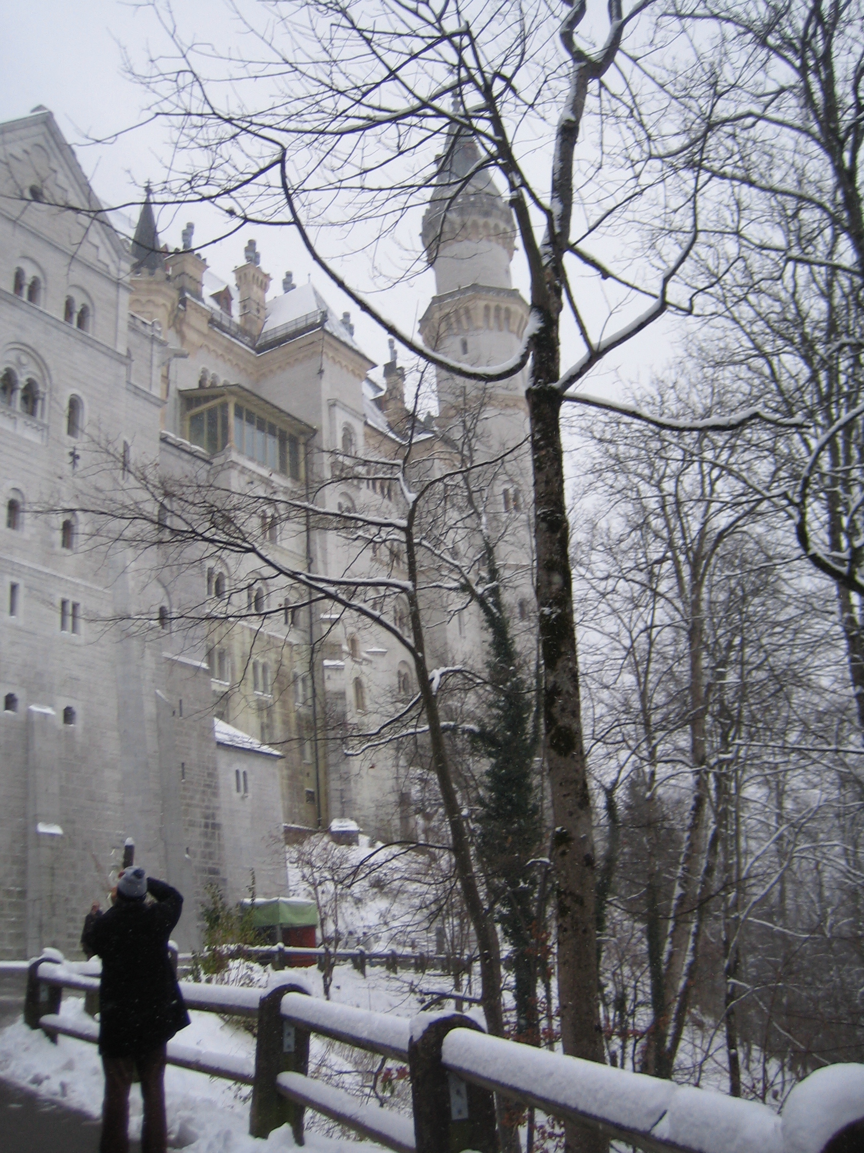 Now one of the best things to do at Neuschwantstein is to go across the Marienbruke (Marien Bridge) a bridge than goes across a river valley. It is a scenic place to take photos of the castle. The bridge was closed because of the snow storm . We couldn’t even see it or the beautiful scenery and views. We did see a lot of snow. Schwangau Lake is visible behind the castle . No, we couldn’t see that either. I was too cold to take my hands out of my gloves to take many photos anyway.