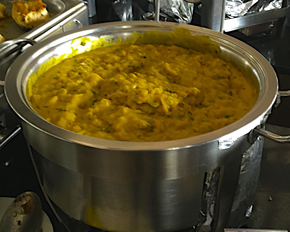 “Vatapá” is a dish made with bread crumbs, ginger, pepper, allspice, peanuts, coconut milk, palm oil, and onion, with a creamy consistency. it is usually served with shrimp, fish, or beef and accompanied with rice. (La Em Casa)
