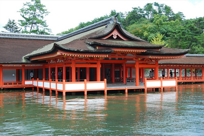 Miyajima is believed to be the island where God dwells. It is said that Itsukushima Shrine is built on the coast because the whole island is  God’s body and is sanctified. Itsukushima Shrine was built at  the end of sixth century and modified to the present building by Kiyomori Taira, who came into power for the first time as a warrior in 1168. It is located in the sea and has a bold structure because the shape changes by the rising and falling tide. The orange lacquered shrine building, green forest  and  blue sea  symbolizes the Japanese sense of beauty.